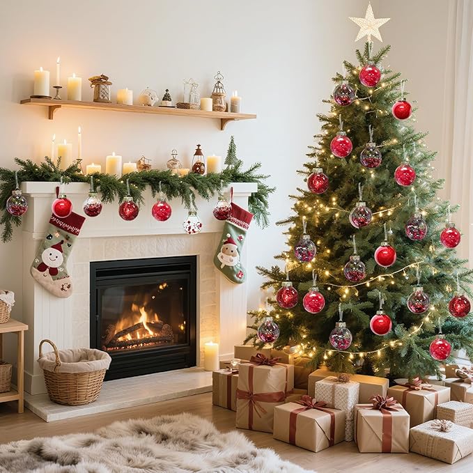DeckTheHalls Christmas Ball Ornaments Set, 16-Piece Clear Plastic Decor for Crafts, Reusable DIY Festive Tree Decorations, Easy Hang Unbreakable Ornaments for Holiday, Party, Wedding (Red)