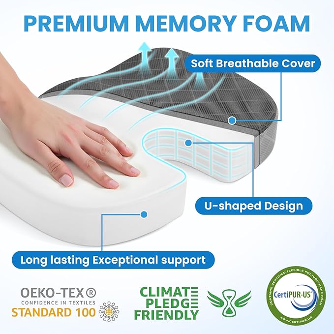 - 【Premium Memory Foam】Our office chair seat cushion is made of 100% pure memory foam, soft and firm, uses your own body heat to adapt to your curves, ergonomic "U" shaped hollow design for superior comfort, effectively support the coccyx, relieve the hip pressure caused by sitting for long periods