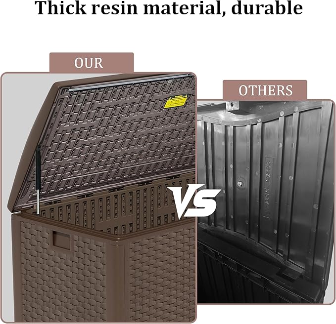 - Weatherproof Resin for Year-Round Use. Durable, waterproof resin, this deck box resists rain, sun, and UV exposure. Ideal for all-season use, it won’t peel, rust, or warp like wooden or metal boxes—keeping your items protected outdoors.