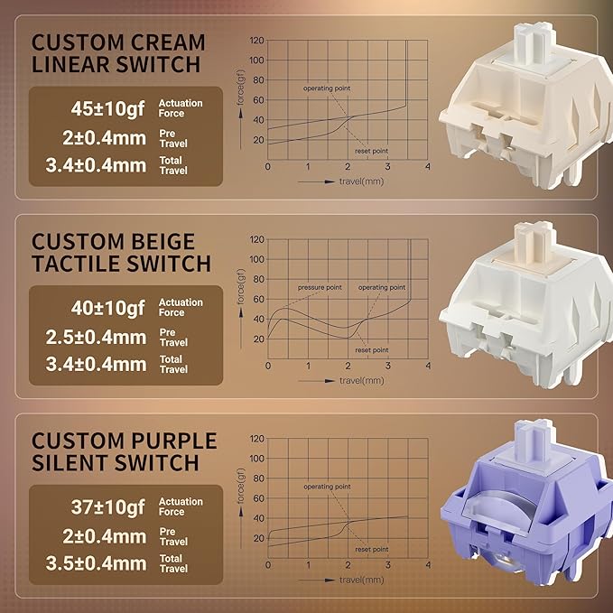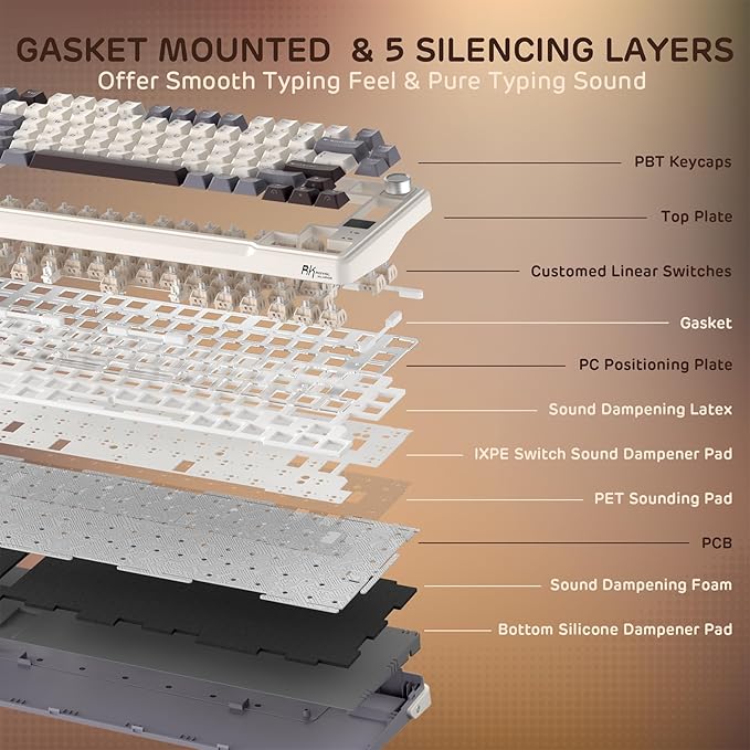 • Five Sound-Dampening Layer — With five layers of internal padding, including 2 layers of thick sound-absorbing foams, an IXPE switch pad, silicone dampener and PET sound-enhancement film, this keyboard structure significantly minimizes hollow sounds and cavity noise, delivering a super smooth and satisfying typing experience.