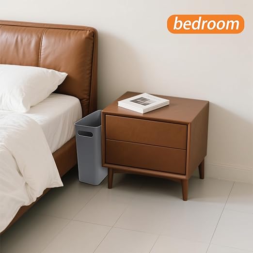 - Slim Rectangular Size: These bathroom wasterbasket measure11 x 5 x 12inch, 2.5 gallon capacity, rectangular slim shape, perfect for narrow limited spaces where larger bins may not fit, such as inside cabinets, under counters, under sinks, next to the toilet or beside a shower or bathtub.