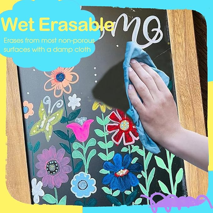 - Effortless Cleanup: Our water-based ink is washable and delivers smudge & dust free - flowing lines that go on smooth and quick dry within minutes. What makes using Liquid Chalk so unique is that you can wet wipe your sign writing art away with a damp cloth, or for more efficiency you can use the Rainbow Blackboard, Whiteboard and Glass Cleaner.Remember to cap the Wet erasable glass pen window marker after each use to prevent drying out.