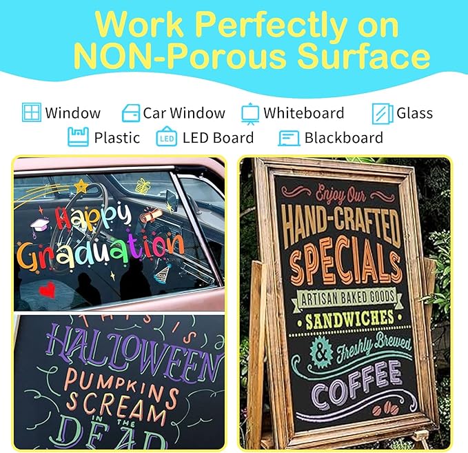 - Versatility Across Surfaces: Make your writing or drawing stand out with Chalk Markers. These brilliant chalkboard markers mark brightly on black boards, light boards, white boards, windows, glass, and more. these jumbo chalk markers prove their versatility on any non-porous surface. Depend on these markers for eye-catching displays or writing in the classroom, your business, or home.Ideal for car decoration, whiteboards, chalkboards, bistro boards, Christmas banners, posters, and various DIY arts and crafts.