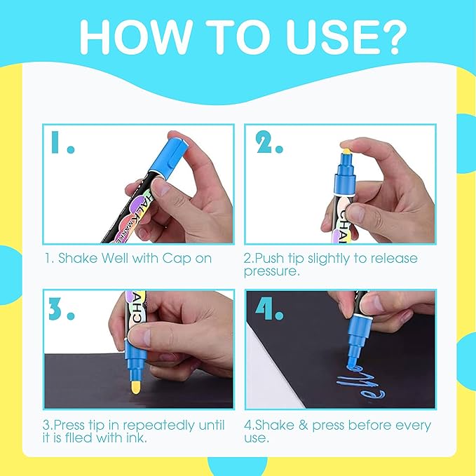 - 6MM Liquid Chalk Markers for Blackboard: Liquid chalk markers with 6mm Reversible Bullet&Chisel Tip allowing you to effortlessly switch between fine and bold lines with a simple flip of the tip. Whether you're creating broad strokes for coloring large areas and crafted for precision, making these chalk markers versatile for all your painting needs.