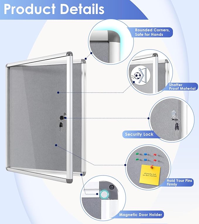 - π Premium Felt Board β Lockable bulletin board is made from dense and high-quality felt that self-heals after pin use, keeping the surface smooth, clean, and ready for repeated posting.