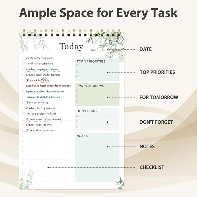 - [TO DO LIST WITH MULTIPLE SECTIONS] - Our to do list notepad offers multiple sections so you can organize and track your tasks better than with a regular list. Each page has a to do list as well as sections for TOP 3 PRIORITIES, FOR TOMORROW, DON'T FORGET and NOTES, making it easy to prioritize and stay organized.
