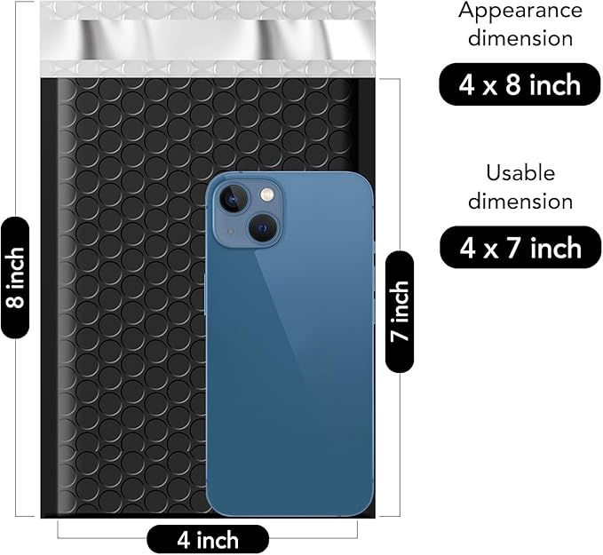 - Full Pallet of Padded Mailers: These black bubble mailers outer size is 4x8 inch, while the inner size is 4x7 inch. It is very suitable to transport for jewellery, makeup, cards, phone case, Lips, photos,handcraft and more. Great for small business packing,shipping gifts cushioning mailer.