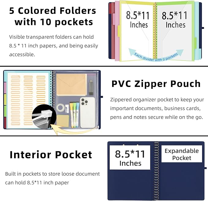 - 【Secure Storage】The portfolio organizer has a clear pouch with a zipper that provides a secure place to store documents, notes, or other items when you're on the go. The clipboard comes with 5 plastic folders that have 10 pockets, fitting all standard US letter-size sheets (11" x 8.5"). It is a great way to keep your papers organized and easily accessible.