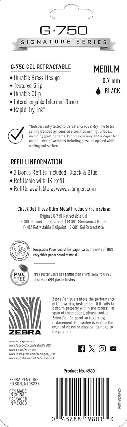 Zebra Pen G-750 Retractable Gel Pen, Pearl White Brass Barrel, Textured Grip, 0.7mm, 1-Pack with Refills (49801)