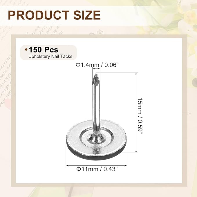 - [Size & Quantity] - The package comes with 150pcs decorative upholstery tacks. Sufficient quantity to meet your different daily needs. The overall size of upholstery nails is about 11mm x 15mm/0.43-inch x 0.59-inch(D*H)