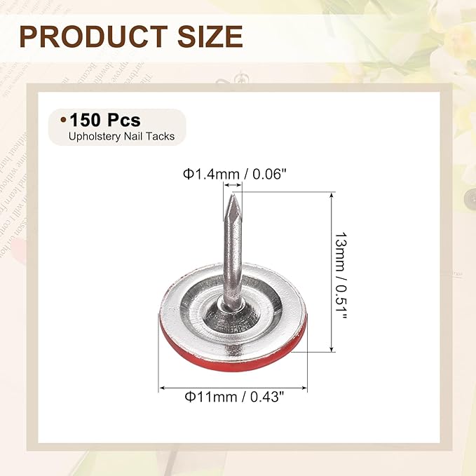 - [Size & Quantity] - The package comes with 150pcs decorative upholstery tacks. Sufficient quantity to meet your different daily needs. The overall size of upholstery nails is about 11mm x 13mm/0.43-inch x 0.51-inch(D*H)