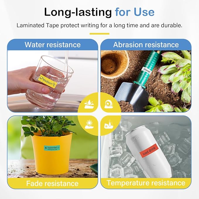 - [Laminated and durable] Compatible with brother label maker tape 18mm are laminated tape, so these label tapes can withstand water/ fade/ abrasion/ temperature. The backing is designed as 2 parts and easy to peel. Strong adhesive and no sticky residue remains when removed