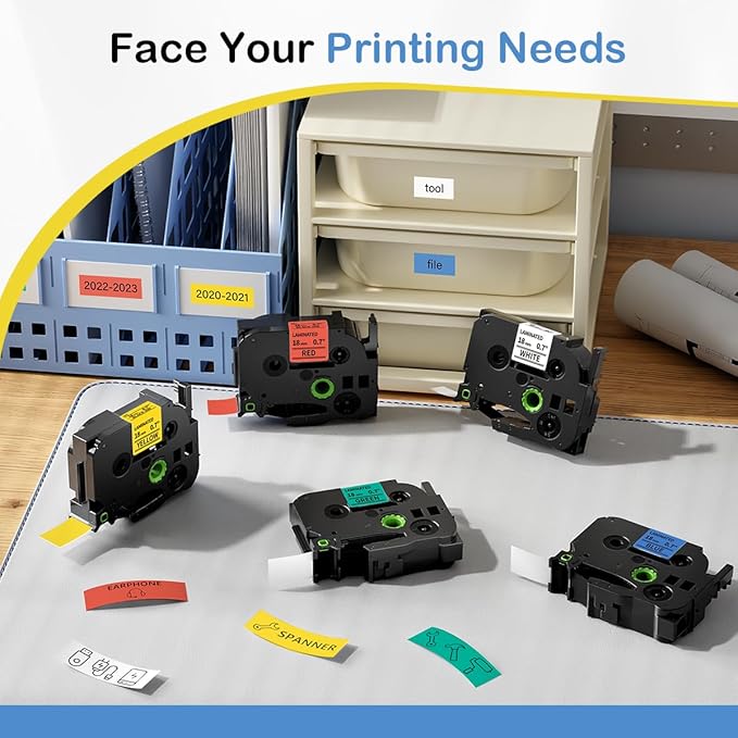 - [Size & Color] Width: 0.7 inch (18mm). Length: 26.2 feet (8 meter) for each tz tape. 5 Colors: Black on White/ Red/ Blue/ Yellow/ Green. Different colors can also help organize a system.