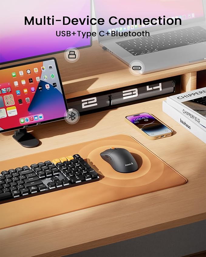 - Connect up to 3 Devices: This compact wireless mouse features Bluetooth, USB and Type-C connectivity, supporting simultaneous connection to three different devices. The Type-C and USB receiver are housed within a dedicated compartment on the back of the mouse. Take it out and plug it into the port of the device separately. You can switch between connected devices with a single button