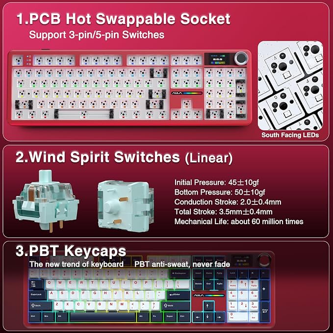 - Smart Display Screen & Multi-function Knob: AULA F108 Pro wireless mechanical keyboard has built-in intelligent TFT color display screen, which can be used as an interactive interface for real-time updating and customization. The high-definition display and multi-function knobs are designed to make it easy to switch and update custom Gif images, volume, date and time, battery status, backlight and connection modes for greater ease of use(Note: You need to download the software under windows system and keep in wired mode to set the screen image/GIF, calibrate the date and time. The screen has a transparent protective film that can be torn off for use)