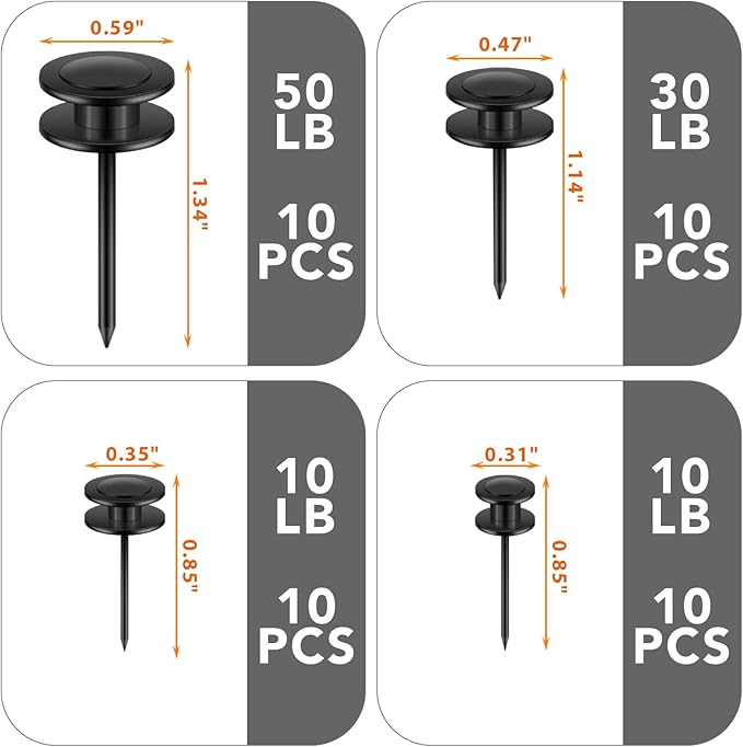 - THUMBTACKS FOR STABLE STRUCTURE: The picture hanging kit are designed with double heads, and the second head provides strong support for the nails for hanging pictures, making it easier to hang heavier objects on the wall without slipping or falling off. Each wall nails for hanging can safely support up to 10/20/30/50 pounds.