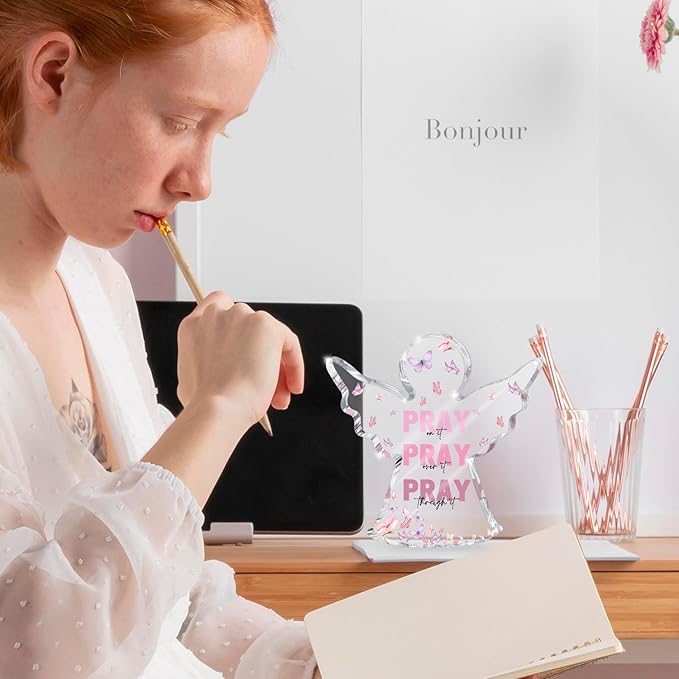Pink Home Office Desk Accessories, Acrylic Memorial Gift, Dorm Room Decor for Women, Christian Gifts for Women, Remembrance Gifts, Pray Over It- Bible Verse Desk Art(Angel Style)