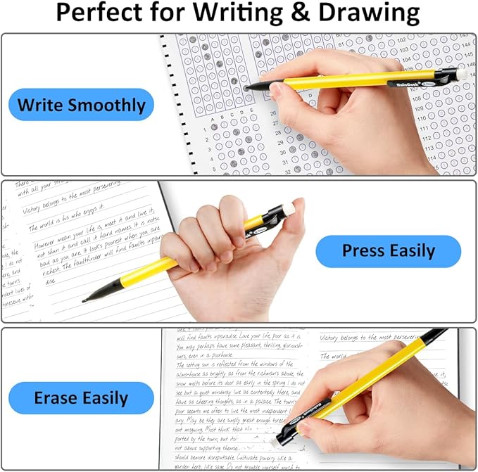 - Ene Eraser with Mechanical Pencil - Each lead pencil comes with an end eraser on the click button, you can erase pencil marks easily and cleanly, and itβs durable enough for normal use.