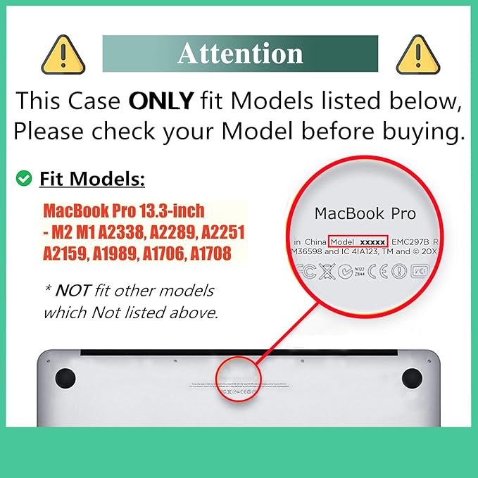 - COMPATIBILITY: Only compatible with MacBook Pro 13 inch Case 2024 2023 2022 2021 2020-2016 Release M2 M1 Chip with Retina Display & Touch ID (Models: M2/M1 A2338 A2289 A2251 A2159 A1989 A1706 A1708). *WARNING: This Case is NOT compatible for MacBook Pro 13 inch 2012-2015 Release A1425 A1502, please check your device's bottom to find the small print "Model Axxxx" and make sure it's exactly same with "A2338" or "A2289" or "A2251" or "A2159" or "A1989" or "A1706" or "A1708"