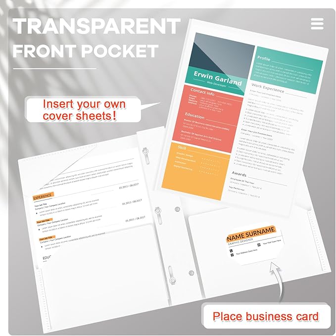 - Practical and Useful: with a clear front pocket, you can put your catalog, tables, favorite reports, presentations and more for clear display; Each plastic folder has 2 internal pockets to help organize and store your letter sized paper and documents, there are also 3 prongs to secure your 3-hole loose leaf paper, and the card slot can hold your ID card or business card, practical for your daily work