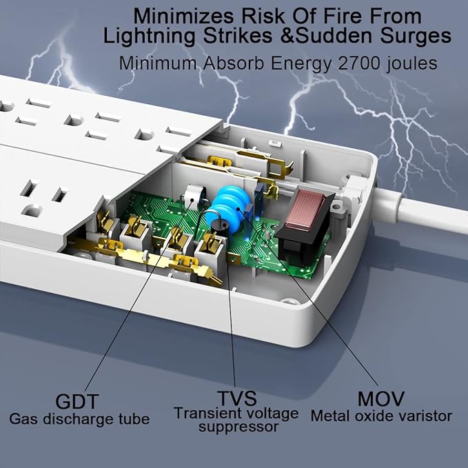 - 【12 AC Surge Protector Outlets】- The 3 level complementary Surge Protector Circuit which composed of TVS (transient voltage suppressor), MOV (metal oxide varistor), GDT (gas discharge tube), with minimum 2700 Joules energy absorbing capacity, could protect your devices much more quickly and reliably than other brand's 1 level MOV Surge Protection Circuits.