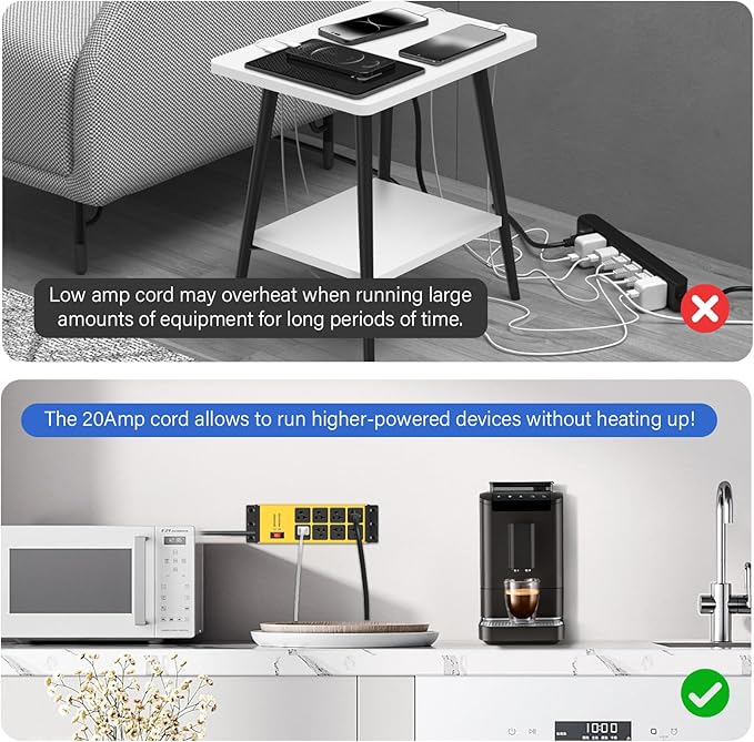 - 12 gauge 12ft heavy cord, rating: AC 20A 125V 2500w. If you are running a lot of equipment for long periods of time or fully loaded 15A equipment, and without overheating.