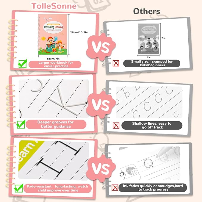 - 【Fade-Resistant Pens Show Clear Progress】Grooved handwriting book includes cute, kid-friendly pens with fade-resistant ink that won’t smudge or disappear—unlike other brands. Kids stay engaged, and parents can clearly see progress over time in every practice copybook.
