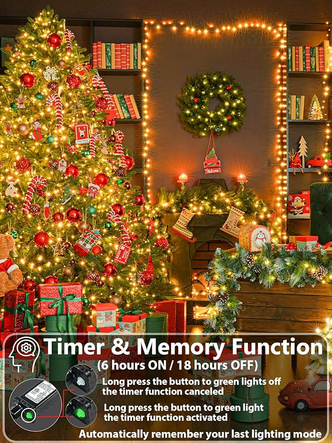 - Unique 8 Lighting Modes & Timer & Memory Funtion: This twinkle lights have 8 modes to fit different occasions, moods, holidays, festivals, anniversaries, etc. Adjust the lighting modes by pressing the round button on the adapter. With built-in timer IC, long press the button of the adaptor to green, the timer function acitivated and it will be on for 6 hours and off for 18 hours repeatedly everday. The Xmas lights also have memory function, will remember your last lighting mode, free your hands from pressing the button everyday