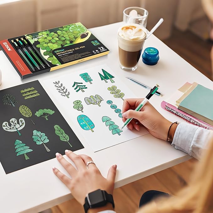 - 12 Lush Green Glitter Shades:Reconnect with nature with ZSCM 12-color Green Glitter Gel Pens, from mint to emerald. With smooth retractable mechanism and 1.0mm precision tip, the glitter ink formula creates vibrant botanical effects for herbarium journals, tropical leaf drawings, and landscape sketching. Unique lightfast technology ensures your green artworks won't fade over time, while the flexible tip handles both details and shading. Bring greenery to life with dazzling sparkle!