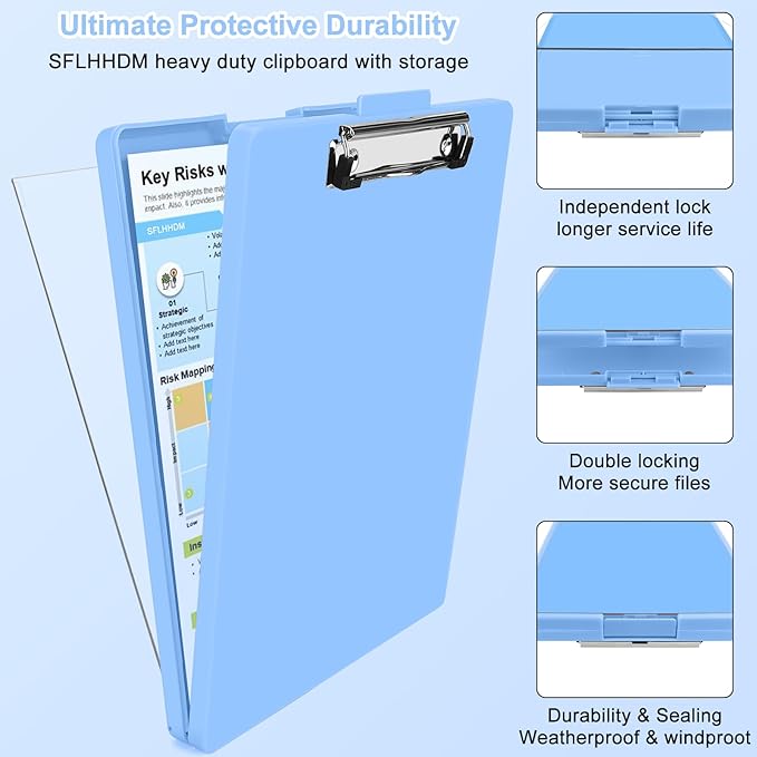 - Quality Material: The clip boards with storage is made of quality sturdy & water-proof polypropylene, reliable and strong, not easy to break or deform, providing perfect strength to the storage clipboards for long-term use. Safe edges/corners (which won't scratch your arms and car paint) storage clip boards, this will be perfect for you