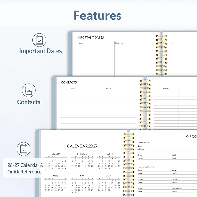 - ADDITIONAL FEATURES: 2026 daily weekly and monthly planner includes 2026-2027 Calendars; Quick Reference; Contact pages; Important Dates for 2026 yearly schedule; Monthly Section; Weekly Section included Dotted Notes pages; Holiday lists; Inner Pocket. Keep you organize throughout the year and easy to use!