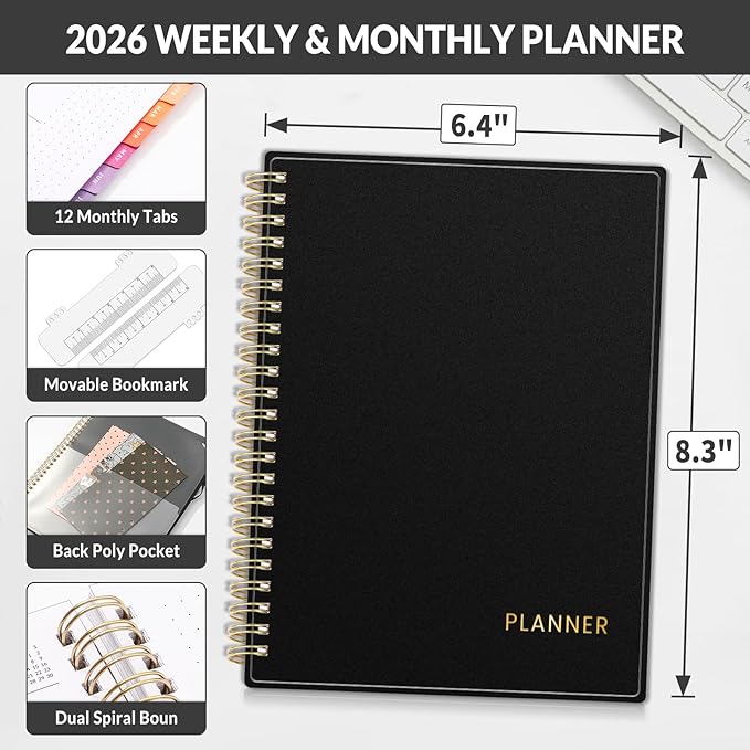 2026 Planner SUNEE Weekly and Monthly Planner - January 2026-December 2026, 6.4" x 8.3" Half Weekly Half Note, Daily 2026 Calendar Planner with PVC Waterproof Cover, Monthly Tab, Note, Bookmark, Black
