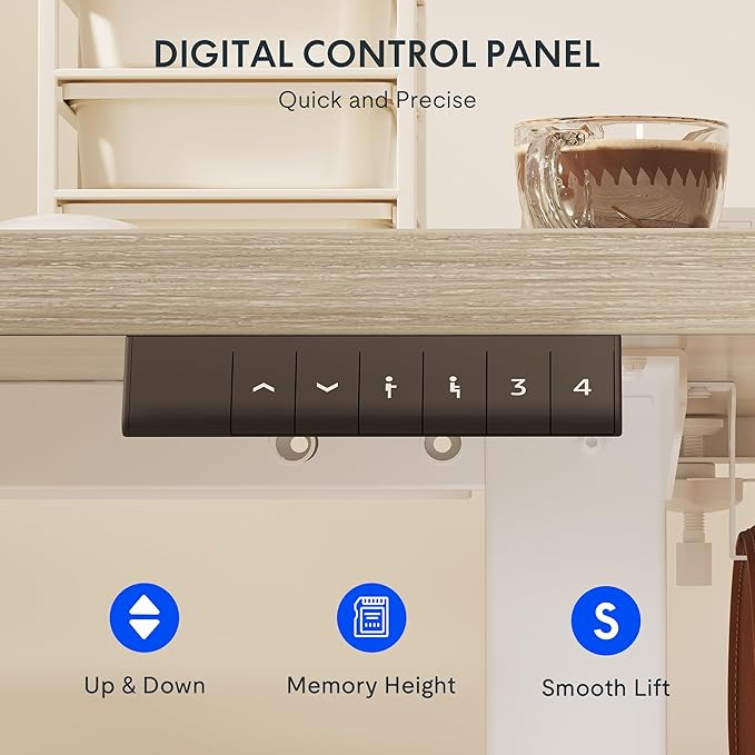 - 4 MEMORY BUTTONS: Easily switch between sitting and standing positions with our 6-button digital controller that features 4 programmable memory presets. The motorized height-adjustable system adjusts smoothly from 28.1” to 45.7”, and the motor runs quietly at less than 50 dB.