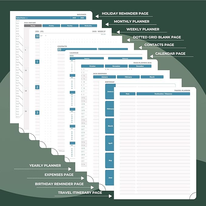 - Great Material for Weekly Planner: Crafted with FSC-100gsm thick paper that resists ink bleed and daily wear, this 2026 planner ensures smooth writing with markers while gentle on your eyes through its ivory white pages. The Vegan leather soft cover and reinforced lay-flat binding make it a calendar planner companion for busy professionals, students, and families