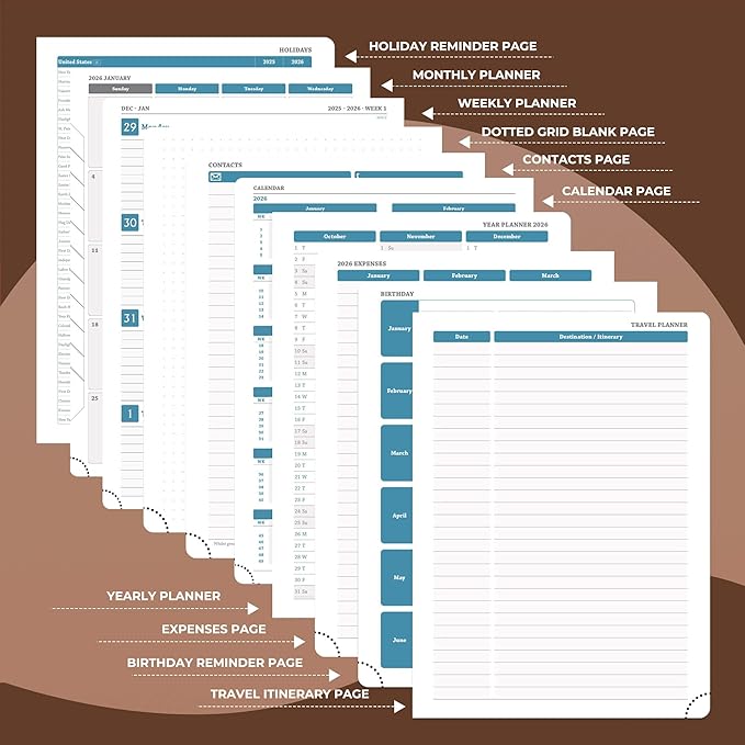 - Great Material for Weekly Planner: Crafted with FSC-100gsm thick paper that resists ink bleed and daily wear, this 2026 planner ensures smooth writing with markers while gentle on your eyes through its ivory white pages. The Vegan leather soft cover and reinforced lay-flat binding make it a calendar planner companion for busy professionals, students, and families