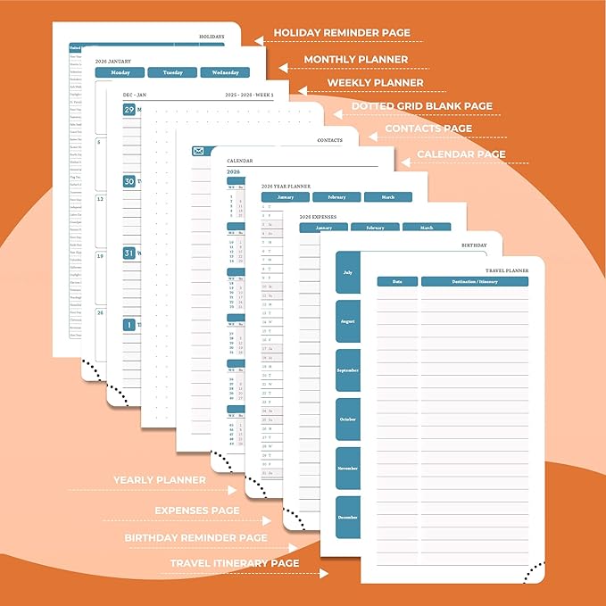 - Great Material for Weekly Planner: Crafted with FSC-100gsm thick paper that resists ink bleed and daily wear, this 2026 planner ensures smooth writing with markers while gentle on your eyes through its ivory white pages. The Vegan leather soft cover and reinforced lay-flat binding make it a calendar planner companion for busy professionals, students, and families