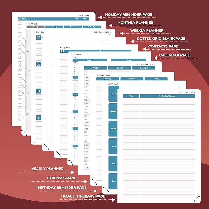- Great Material for Weekly Planner: Crafted with FSC-100gsm thick paper that resists ink bleed and daily wear, this 2026 planner ensures smooth writing with markers while gentle on your eyes through its ivory white pages. The Vegan leather soft cover and reinforced lay-flat binding make it a calendar planner companion for busy professionals, students, and families
