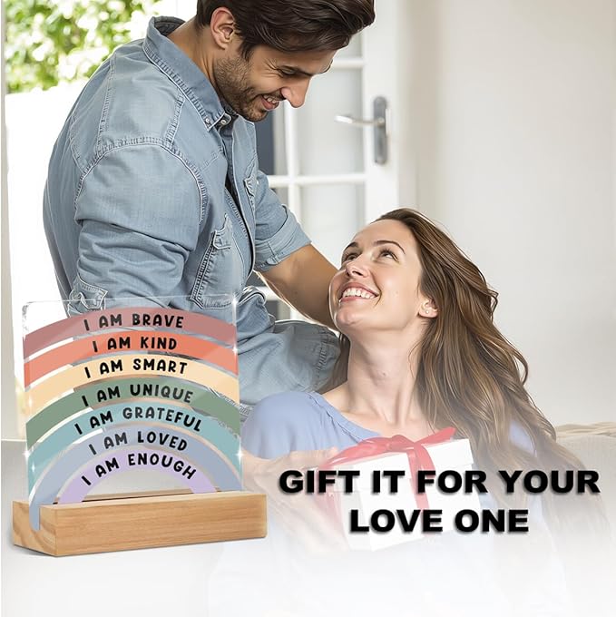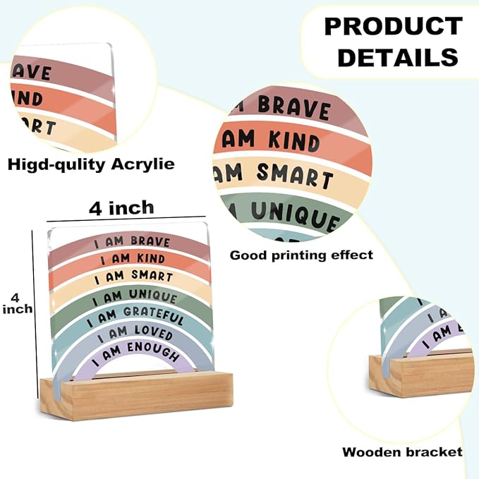 Positive Affirmations I Am Enough Desk Decor Acrylic Sign 4x4 Inch, Inspirational Gifts for Women Men, Cute Rainbow Desk Gadgets Table Top Cubicle Accessories Office Living Room Bedroom Decor