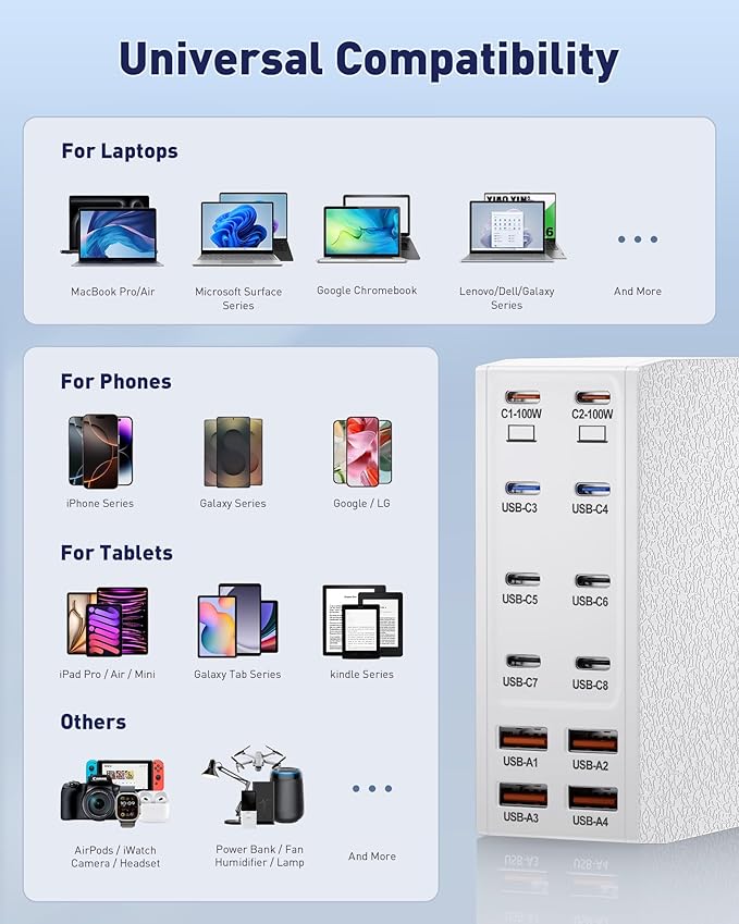 - 【Universal Compatibility】Our USB C charging station is equipped with 2*100W and 2*65W fast charging ports, which can charge 3 or more laptops at the same time. Compatible with smartphones, tablets and laptops, suitable for MacBook Pro/Air, Dell XPS, iPad Pro, iPhone 16/16 Pro Max, iPhone 15 Pro Max, iPhone 14/13 Pro/12 Pro Max, iWatch, AirPods, Surface Pro, Galaxy S24 Ultra, Switch, Steam Deck, Google Pixel and many other devices.