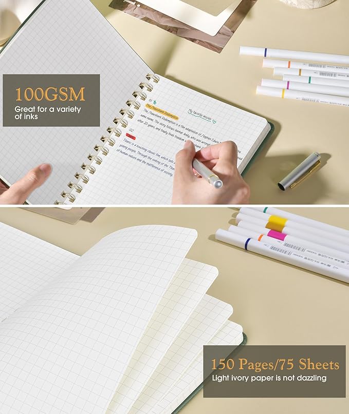 Graph Spiral Journal Notebook, A5 Hardcover Spiral Journals for Women Men, 100 GSM Graph Paper Notebooks, 150 Pages Spiral Bound Grid Notebook for Writing Note Taking Work 5.75" x 8.38", Sage Green