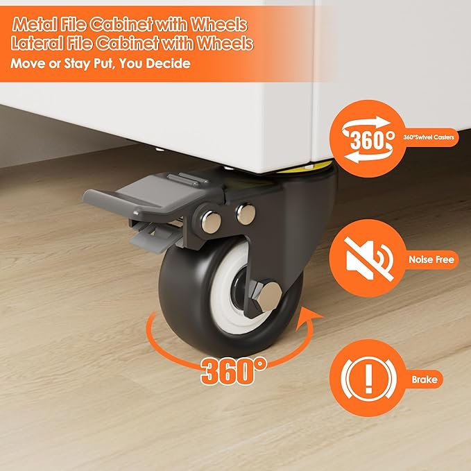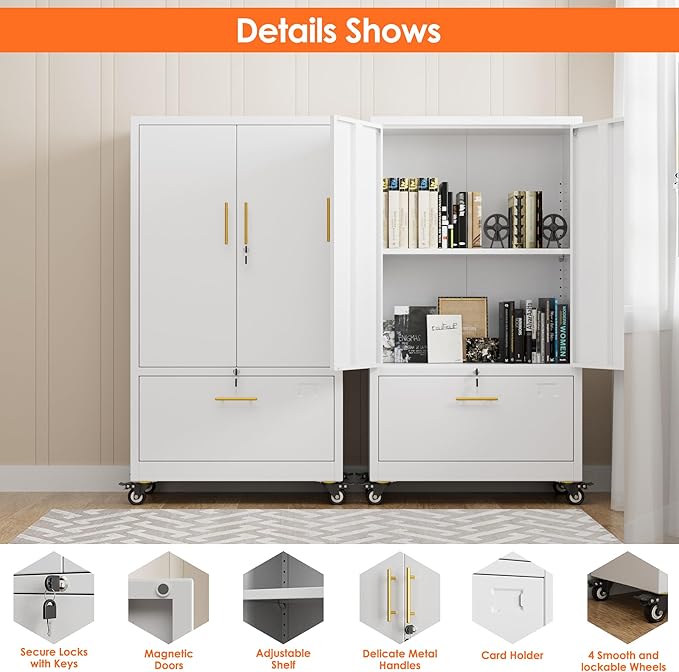 Aobabo Metal 1 Drawer Office File Cabinet with Lock and 2 Doors, Office Steel Files Cabinet with Wheels, Legal/Letter A4 Size, Assembly Required, White