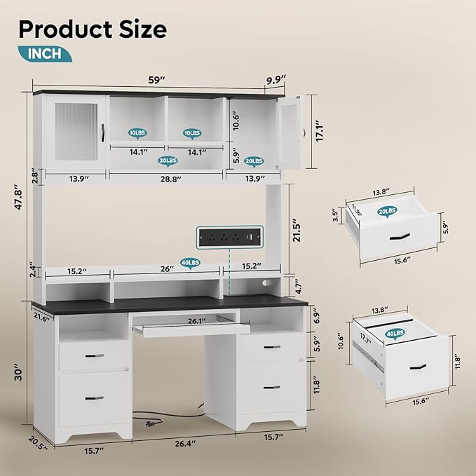 Bestier 77.8" H Executive Desk with Hutch, Modern Wood Computer Desk with Drawers, Charging Station, LED Light, Fluted Storage Cabinet, Keyboard Tray, 59" W Office Desk for Home Office, White