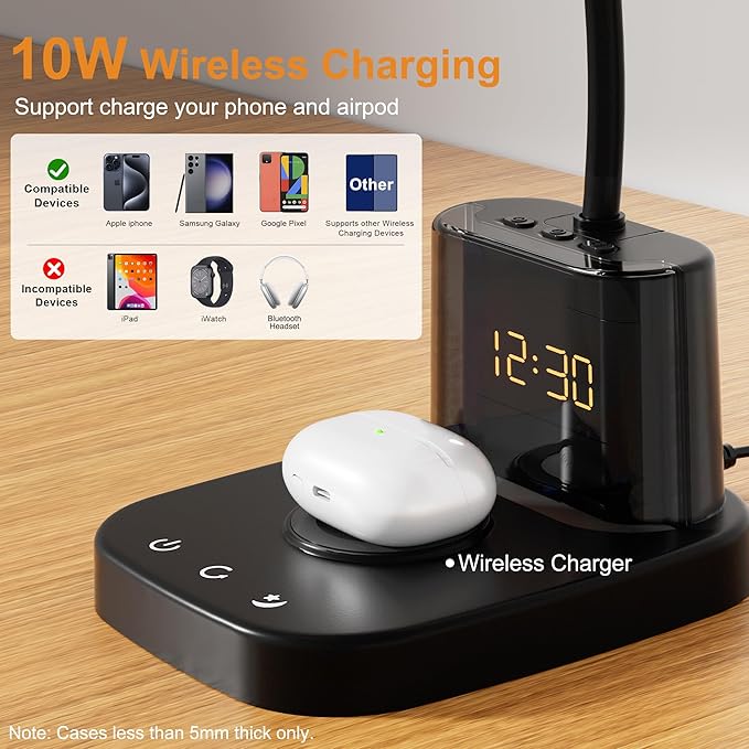 - LED Desk Lamp with Wireless Charging: The black bedside lamp features a built-in wireless charger. You can wirelessly charge your phone by laying it down flat. The wireless charger is compatible with iPhones and most devices that support fast-charging smartphones at 10W. The desk light comes with a 5V/3A, 1.8m power adapter, delivering optimal charging performance and stable lighting. Note: Please do not use the 5V/1A or 5V/2A adapter.