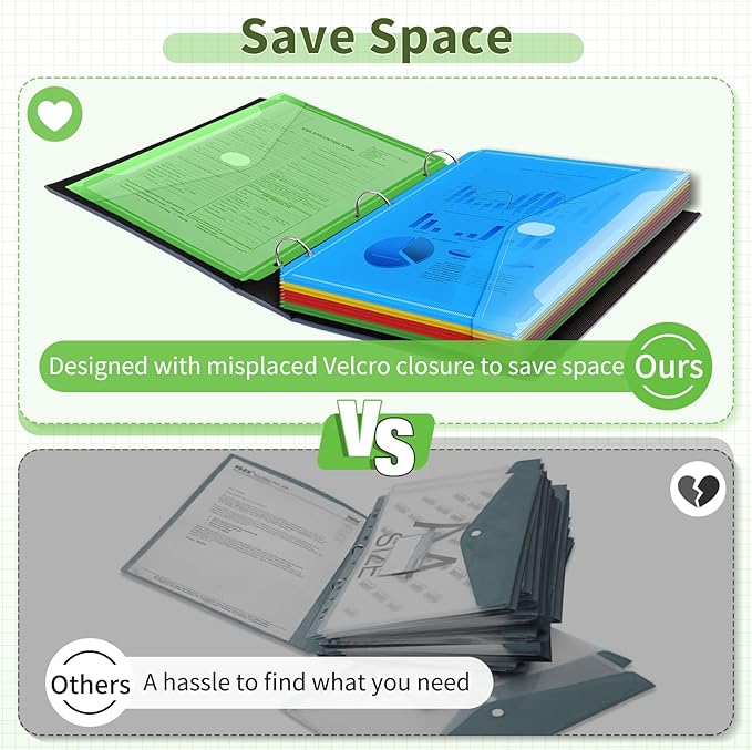 - Save Space & Keep Safe: 3 Holes punched, fit for standard 3 ring binders. The binder pockets are designed with closing velcro in alternating spots (left, right and middle) helps from it being middle bulky. The pocket folders with safe closure can ensure contents stay safe.