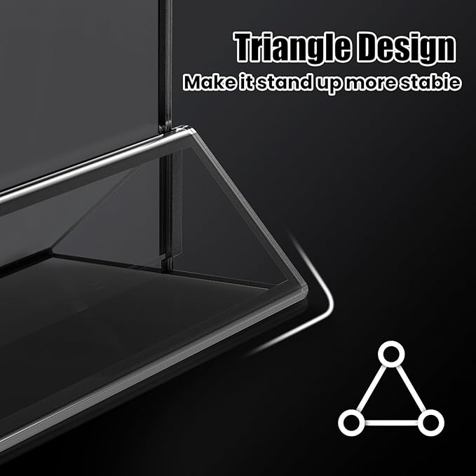 - 【Easy to Assemble】Only 3 steps to get the acrylic stand ready for use, firstly tear off the protective film on the acrylic blackblack frame, adopt the triangular groove base for better inserting the table sign or anything you want to display. At last, push the frame into the base. And if you want to store them, you can just separate the frame and base and put them into a box without any hassle.