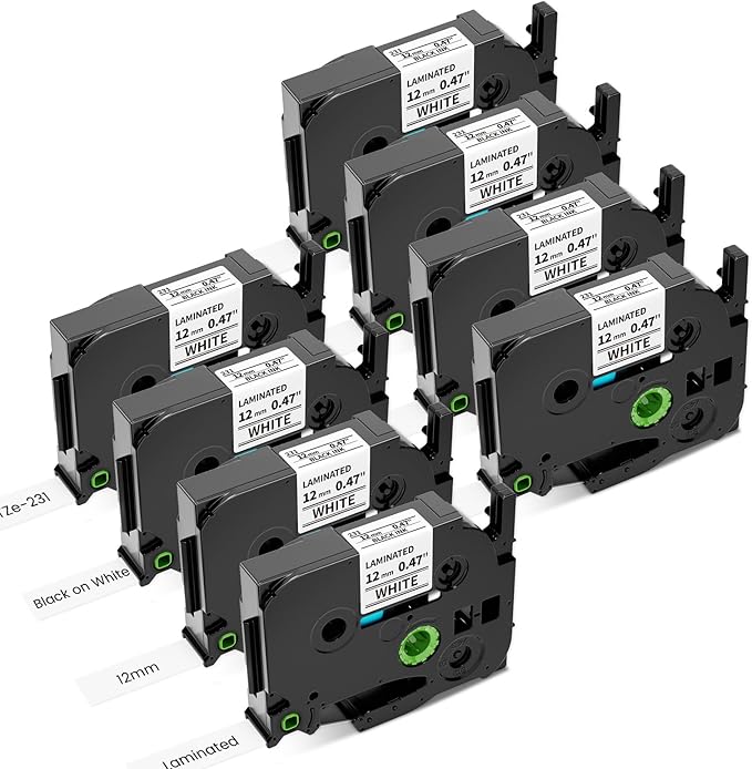 Airmall Tze 12mm 0.47 Laminated White Label Maker Tape Refill Compatible with Brother Ptouch Tape 12mm 0.47 White TZe-231 TZe231 for PT-D220 1180 1280 1290 1750 1830, 8 Pack