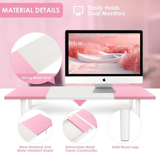 - ADJUSTABLE LENGTH MONITOR STAND: The length of the dual monitor riser for desk can be retractable from 32 in to 40 inch, you can flexibly adjust length according to the space and the different size of screen. You could adjust to the short length when you only need single monitor to save space. Adjusting to the long length if you need multiple computers to work at the same time.