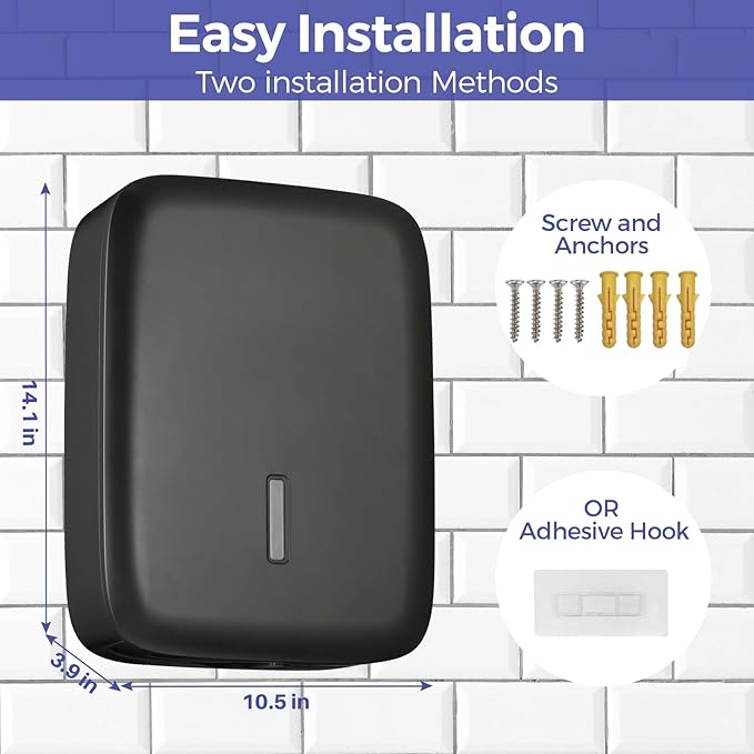 - Two installation Methods - Easily install the paper towel dispenser using the provided screws and anchors, Or no drill on the wall and mount using adhesive hook.