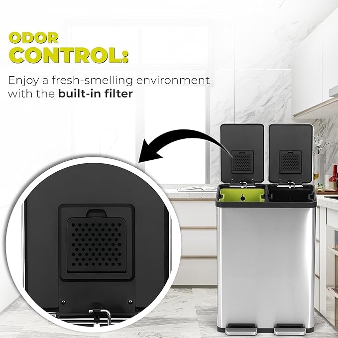 - HANDS-FREE USE: The stainless-steel foot pedal stands up to daily use and removes the need to touch the lid during waste or recycling disposal to keep hands clean.