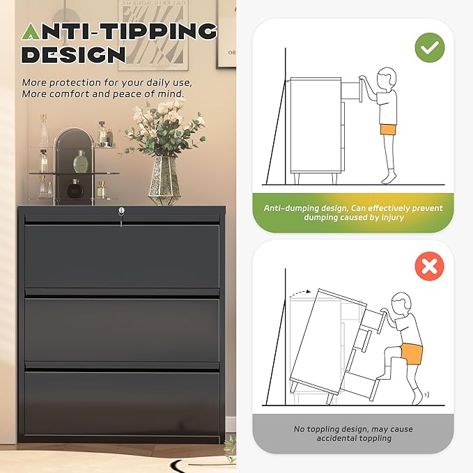 Superday Lateral File Cabinet 3 Drawer Metal File Cabinet with Lock, Black Filing Cabinets for Home Office, Locking Filing Cabinets Hanging Files Letter/Legal/F4/A4